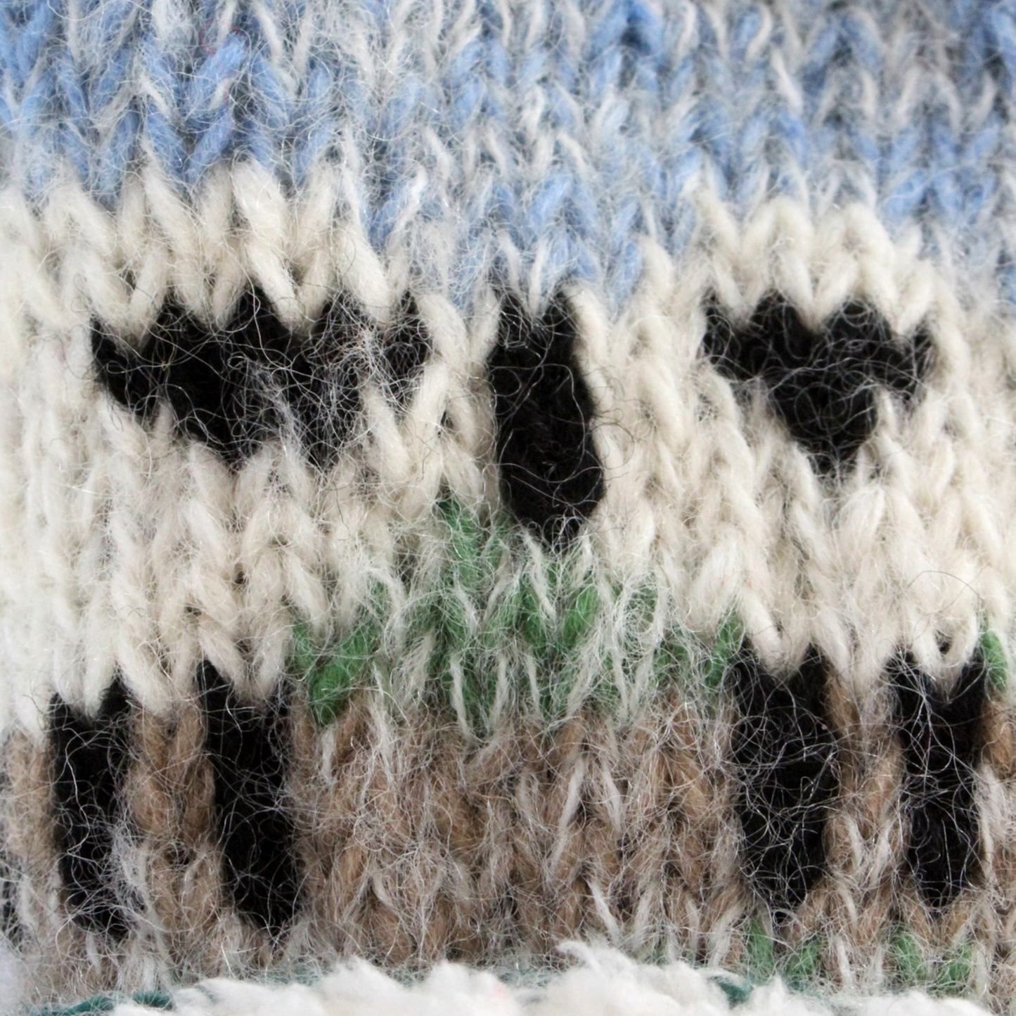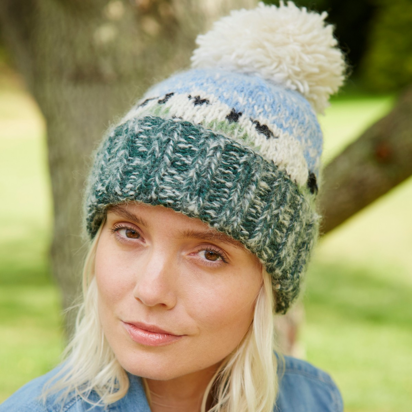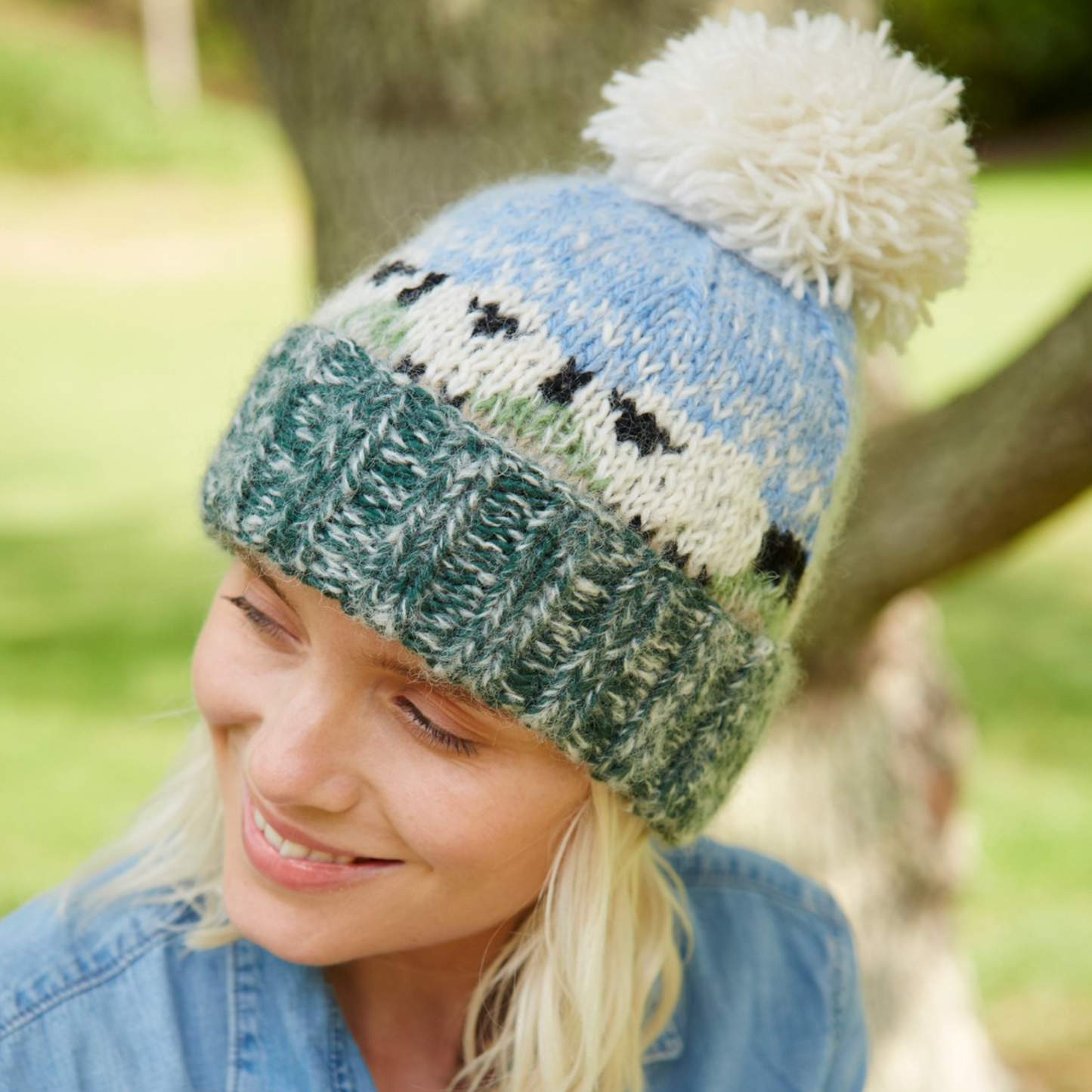 Women's hand knitted wool mohair blend and sherpa fleece lined bobble hat, with farm animal sheep patterns, fair trade and handmade in Nepal.